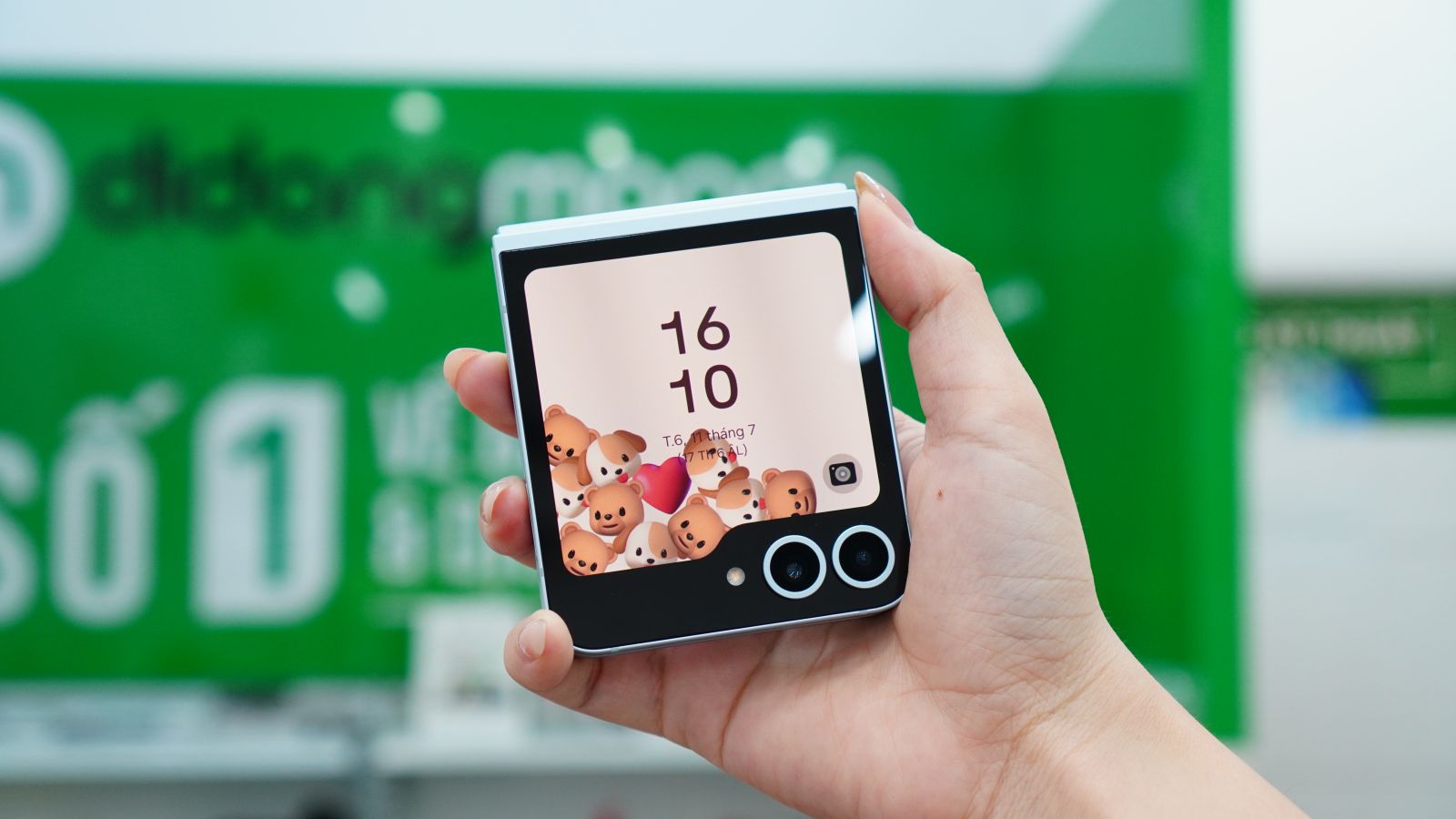 Màn hình trên Galaxy Z Flip 6 tiếp tục ghi điểm mạnh với chất lượng hiển thị cực kỳ sắc nét và sống động. Màn hình phụ bên ngoài có kích thước 3.4 inch, sử dụng tấm nền Super AMOLED, giữ nguyên thiết kế cắt góc quanh cụm camera quen thuộc. Dù không chiếm trọn mặt trước, nhưng độ sáng và độ nét đều ở mức rất tốt, giúp bạn xem nhanh thông báo, chụp ảnh selfie hay trả lời tin nhắn một cách thuận tiện và rõ ràng.